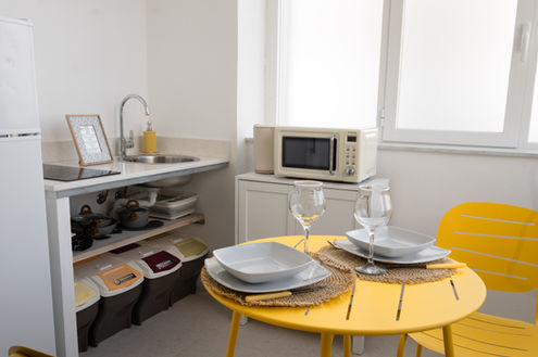 There is a small outdoor space available to everyone where they can leave their bicycles, and a common corner where they can find beach kits and cleaning kits for longer stays.